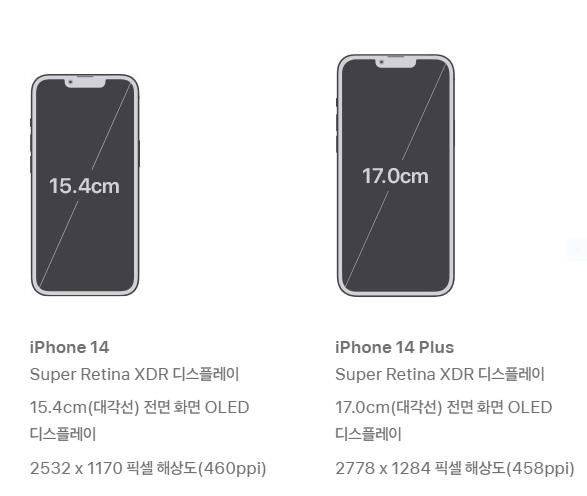 아이폰시리즈에서 큰 디스플레이를 원한다면 아이폰 14 프로맥스 모델을 구입해야 했지만 아이폰 14 플러스와 아이폰 14 프로맥스의 디스플레이가 6.7인치로 동일함으로 선택의 폭이 하나 더 생겼습니다.